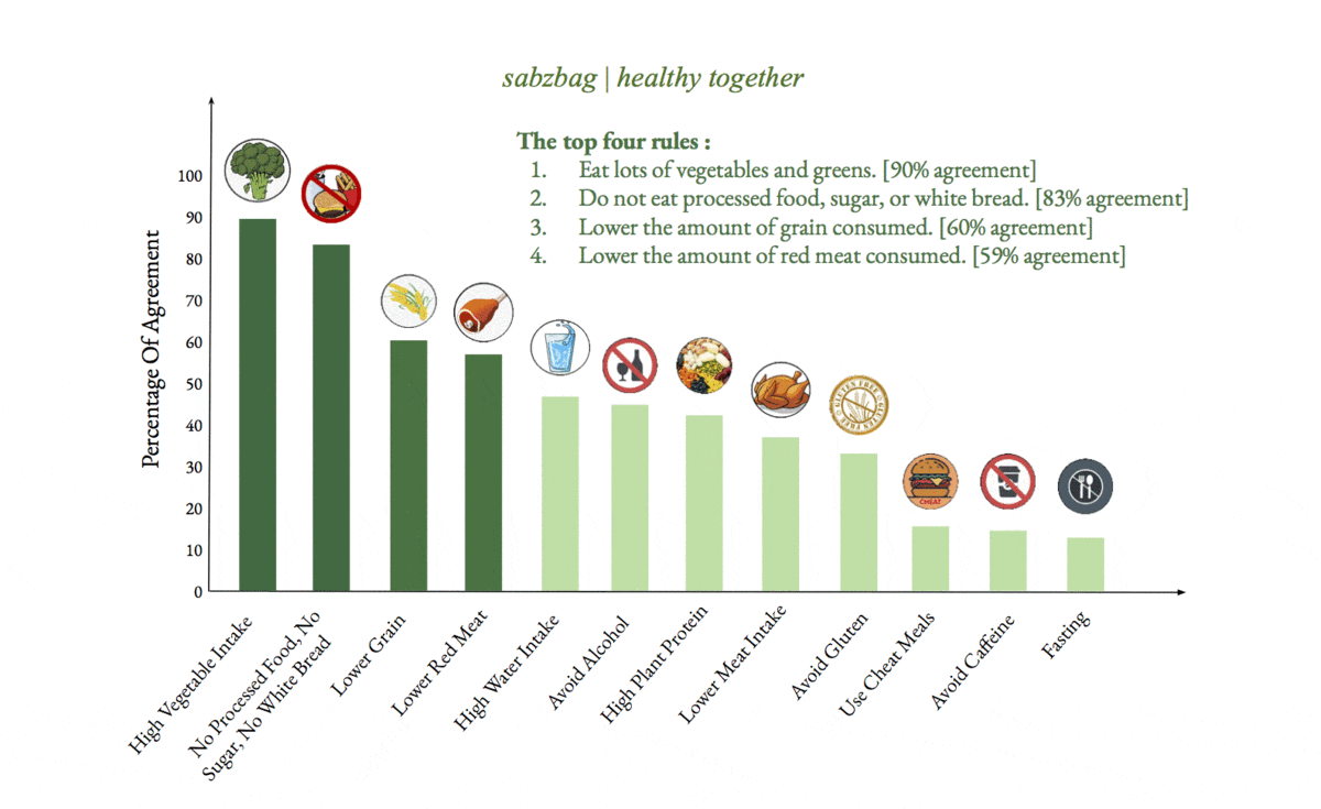 Figure 1: Percent (%) agreement among experts on nutrition advice. The height of a bar indicates what % of experts agreed on this topic. For example, there was near unanimous agreement (92%) on avoiding processed food to achieve better health and that is shown on the extreme left with a dark green bar, whereas only 8% of experts agree on using cheat meals as a part of a healthy nutrition plan hence the height of the cheat meal bar is much lower and it is positioned on the extreme right.